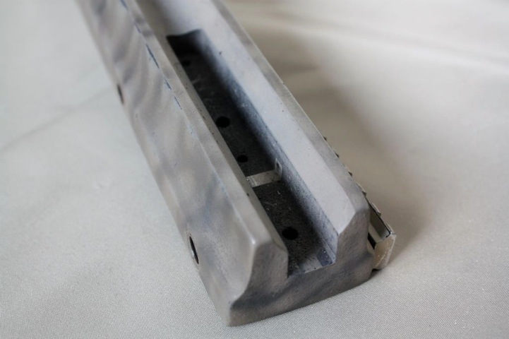 Bilden visar den urfräsning i framstocken som behövs för att montera skenan. Nästa steg i monteringen är att borra hål genom stocken.