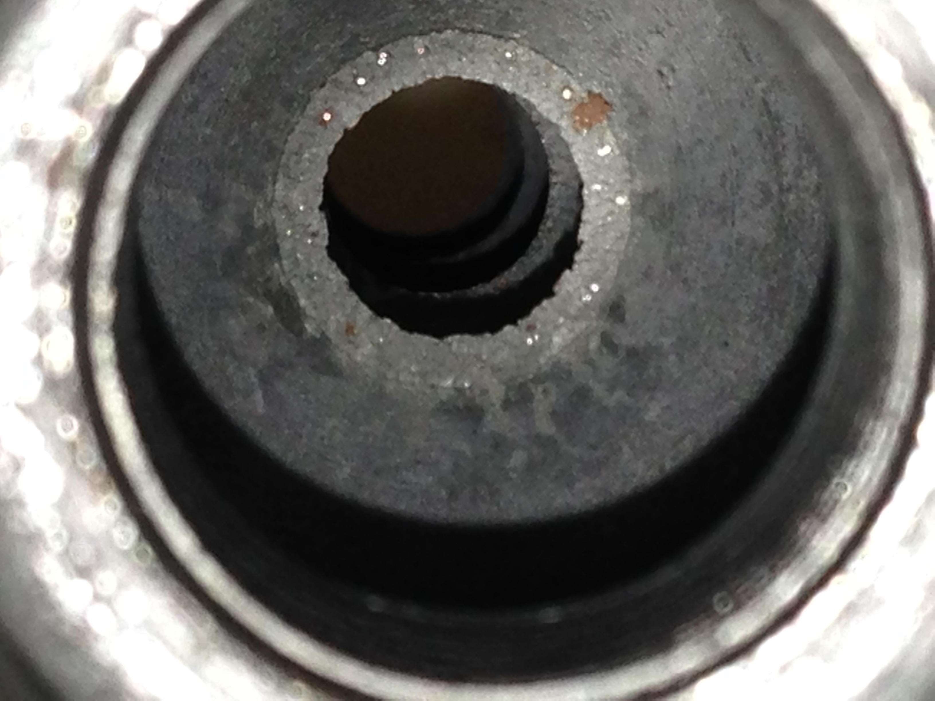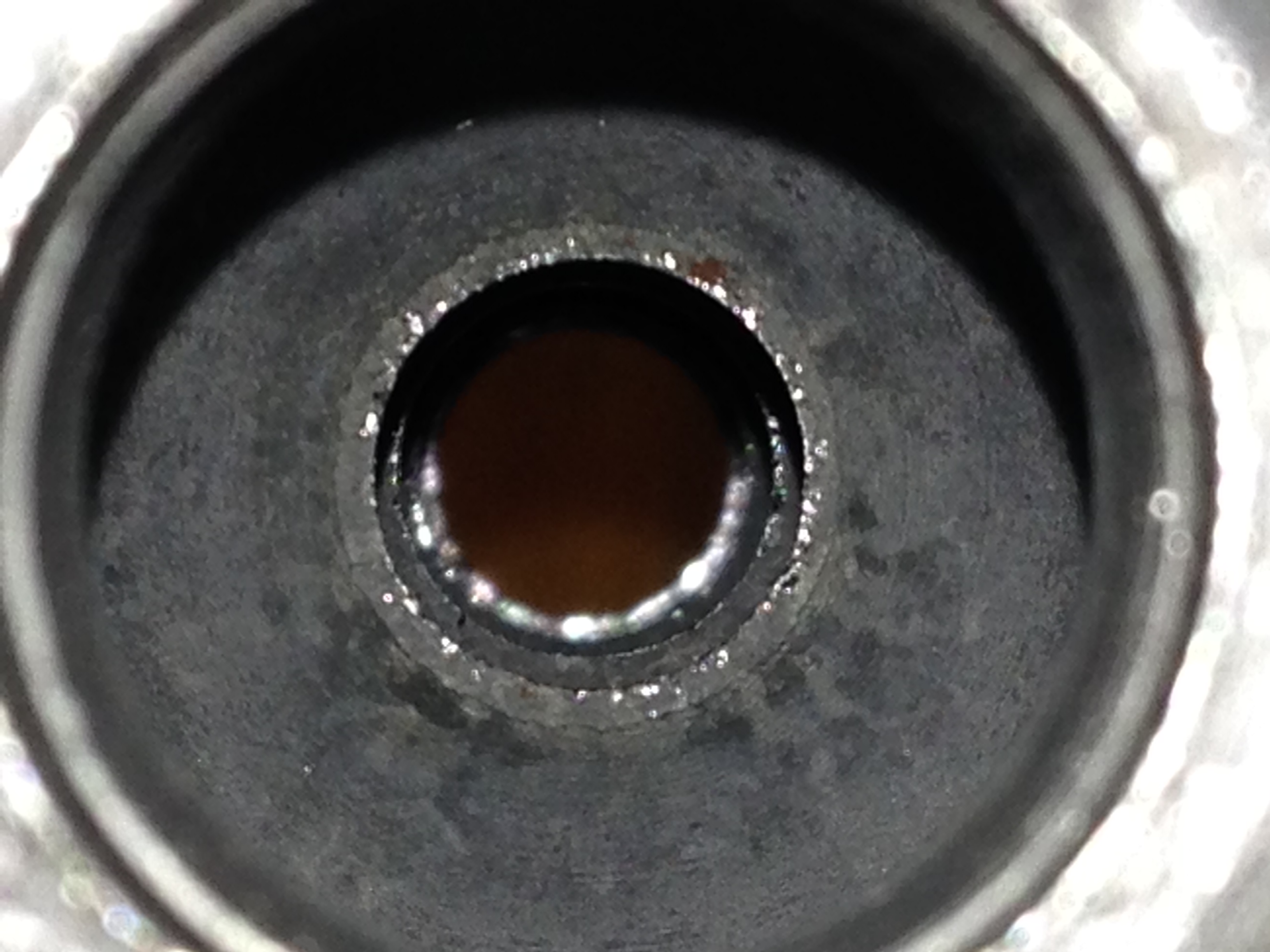 My solution was to open up the hole again. I think that the life of this suppressor soon to be over. So to give the bullet (and my self making the hole) some margin of error I made the hole 9.5mm. This will make the suppressor less effective suppressing the noise but it will also let more heated gases pass thru. That gives some longer time shooting before freeboore boost kicks in. This is the same first baffle after the operation.