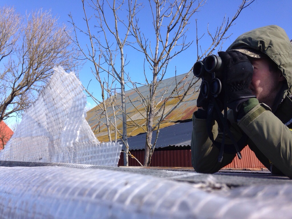 Därefter hoppade vi ner från containern för att skjuta i annan riktning. Det var nämligen dags att skjuta på målet som stod ute på 780m. Här ses skytt och spotter diskutera strategier för vindbedömning. Detta var alltså en bedömning som skedde enbart med hjälp utav en vindflagga monterad på plåtmålet 780m ut.