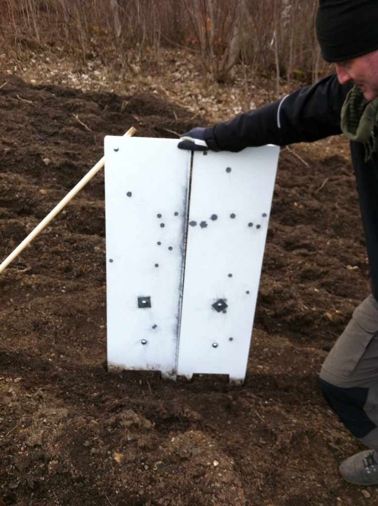 Efter lite velande valde vi 780m som dagen längsta skjutavstånd, placerade ut våra nya, i samarbete med Magnus på Leaf Supply, egendesignade plåtmål. Dessa mål mäter 100cm*30cm och är av typen ”Stab and Shoot” mål. Fördelen med just dessa mål är att de går att sätta ihop för att bygga ett större mål, de ger skytten möjlighet att fästa en vindflagga direkt i plåten samt har hål för att enkelt kunna fästas upp på en regel vid ex. skytte på mosse där plåten måste komma upp en bit. Vi kommer att presentera dessa mål mer utförligt vid ett senare tillfälle.