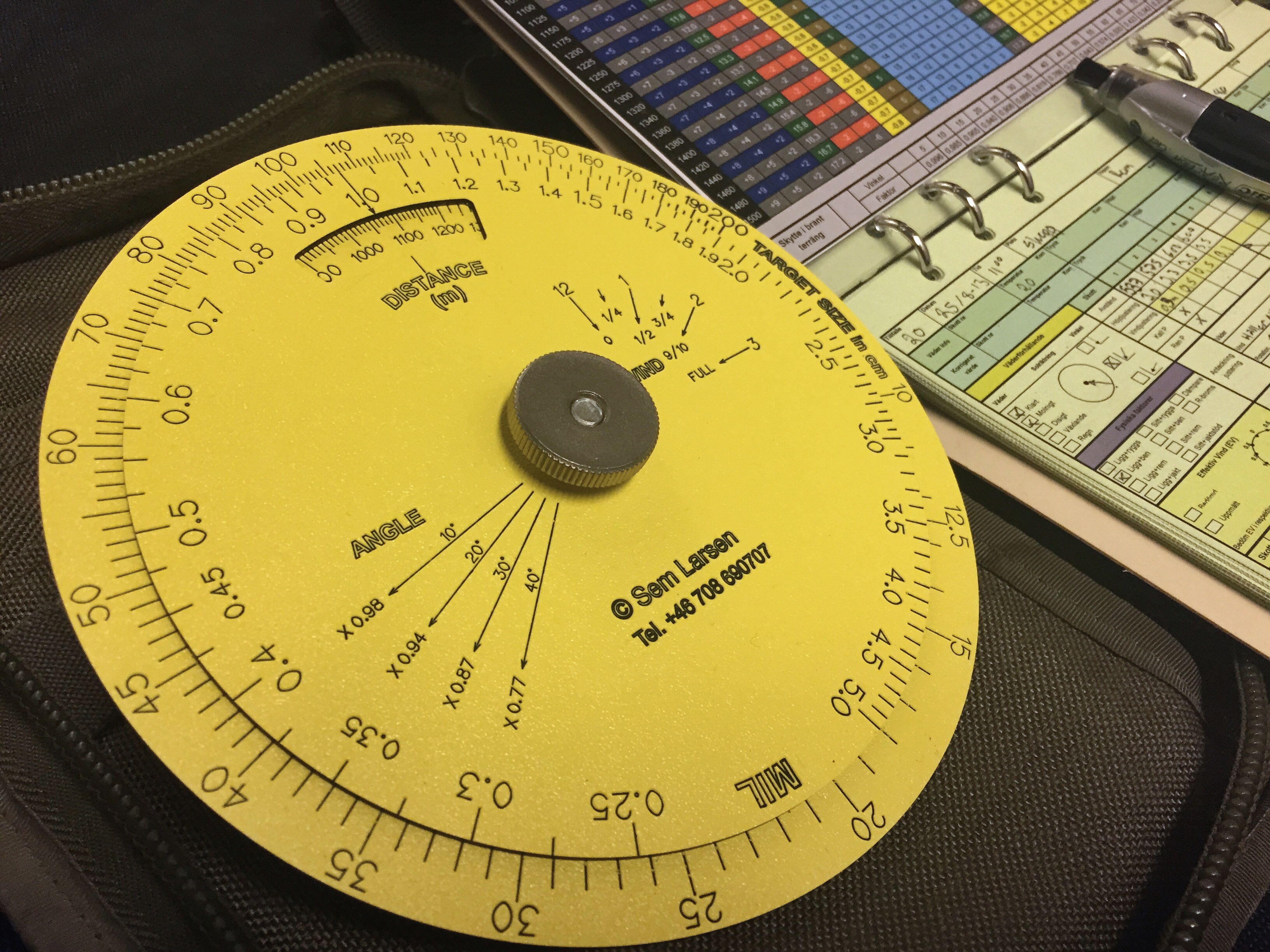 Helgens pryl som det blev mycket snack runt var Sem Larsens nya Truemiller. Ett enkelt men ändå väldigt precist redskap för att bestämma avstånd genom millning. Den fungerar helt enkelt så att du hittar målets bredd / höjd i cm på den yttre ratten, därefter roterar du den inre ratten (mil) det antal mil som du ser i kikarsiktet / målkikaren så att inre och yttre ratten stämmer överens. När detta är klart visas rätt avstånd i urfräsningen ovan ”Distance”. Ett bra redskap för denna typ av tävling men självfallet även under fältskytte i kikarklass. Vill ni beställa denna gör ni det enklast på sem.larsen@gmail.com.