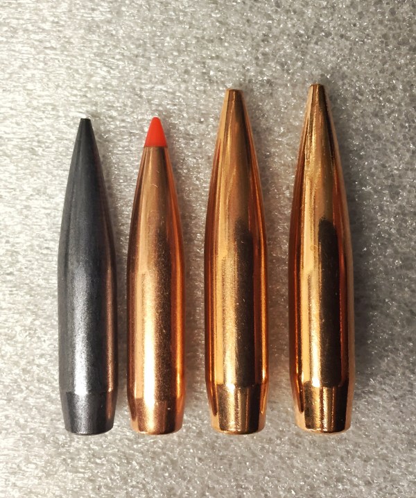 Från vänster Norma 130gr DL, Hornady 140gr A-max, Lapua 180gr Scenar-L & Berger 180gr Hybrid