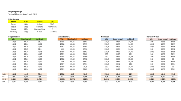 Testet genomfördes genom att mäta vikten med en kalibrerad RCBS Chargemaster och längd med ett väldigt bra skjutmått. Följande värden hämtades in: