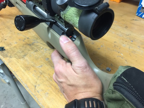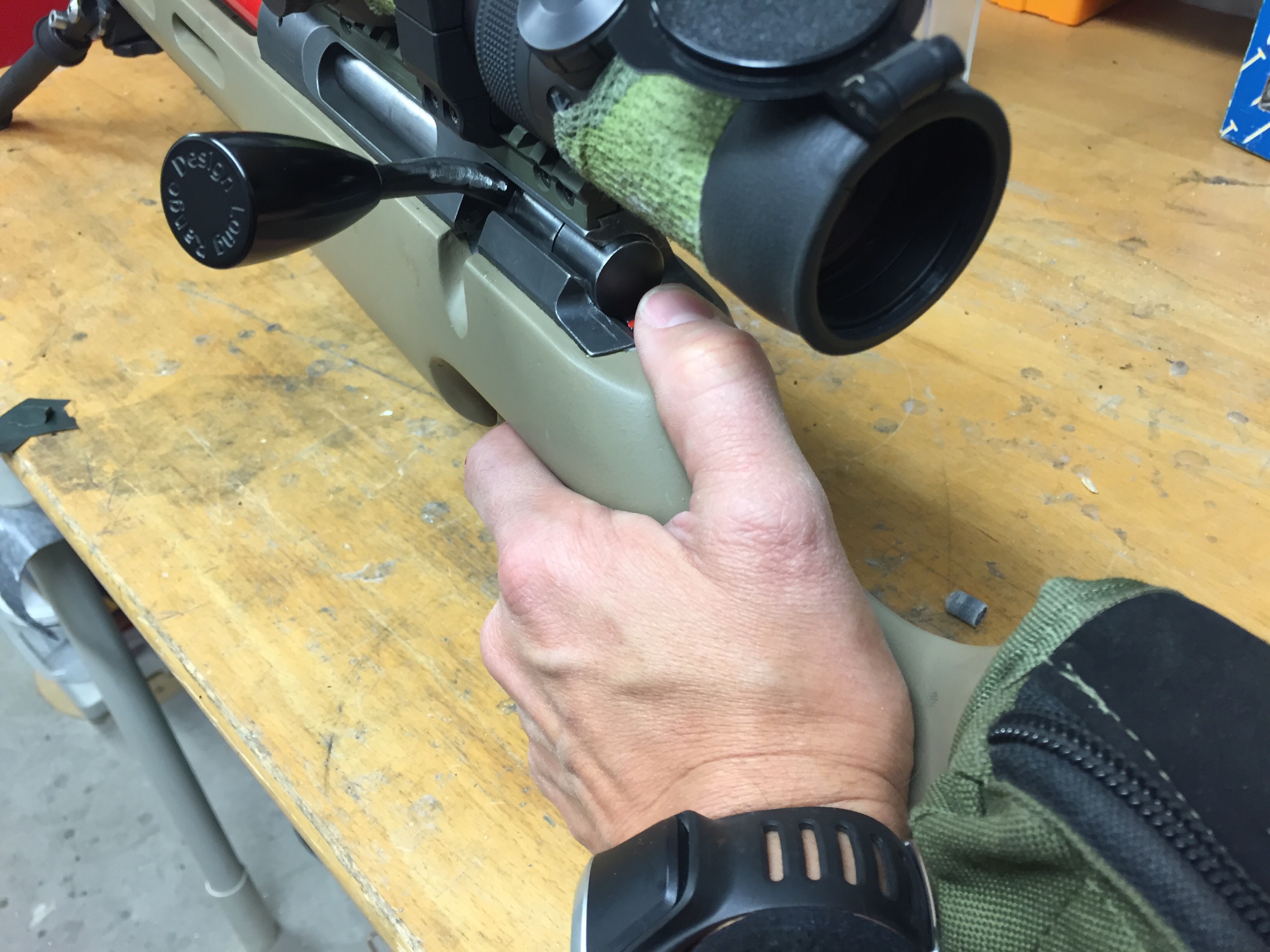 Övningen ovan är en enkel men avslöjande övning. Skytten laddar 1 skott i magasinet och placerar därefter 4 patroner ca 2-3 meter bakom skjutplatsen. I samband med att första skottet går startar tiden. Skytten har två minuter på att skjuta ytterligare 4 skott mot undre punkten. Så mellan varje skott måste skytten kliva upp, gå bort och hämta samt inta skjutställning och ladda en ny patron. Denna övning går att göra på alla avstånd, jag valde göra ovan på 100m. Själva bladet för övningen finner ni här : LänkMitt resultat avslöjar en liten men okey vertikalspridning. Det som är intressant är att jag har rätt stor spridning i sida, något som inte bör förekomma. Efter lite analyserande och fler tester så inser jag mitt teknikfel. Det visade sig att sidosprideningen kom utav att jag slarvade med min avfyrningsreknik. Utan att tänka på det när jag sköt så positionerade jag tummen på tre olika sätt mot kolven vid avfyrningen. Det visade sig att när jag sköt med tummen rakt bakom mekanismen, enligt bild 1 så påverkas vapnet betydligt mindre i sida vid snabba skott. Detta kommer sig utav att handen kommer in i centrum och pekfingret trycker avtryckaren rakt bakåt istället för till sidan. Övriga positionerna genererade för mig i detta fall en sidospridning på ca 1 cm på 100m.
