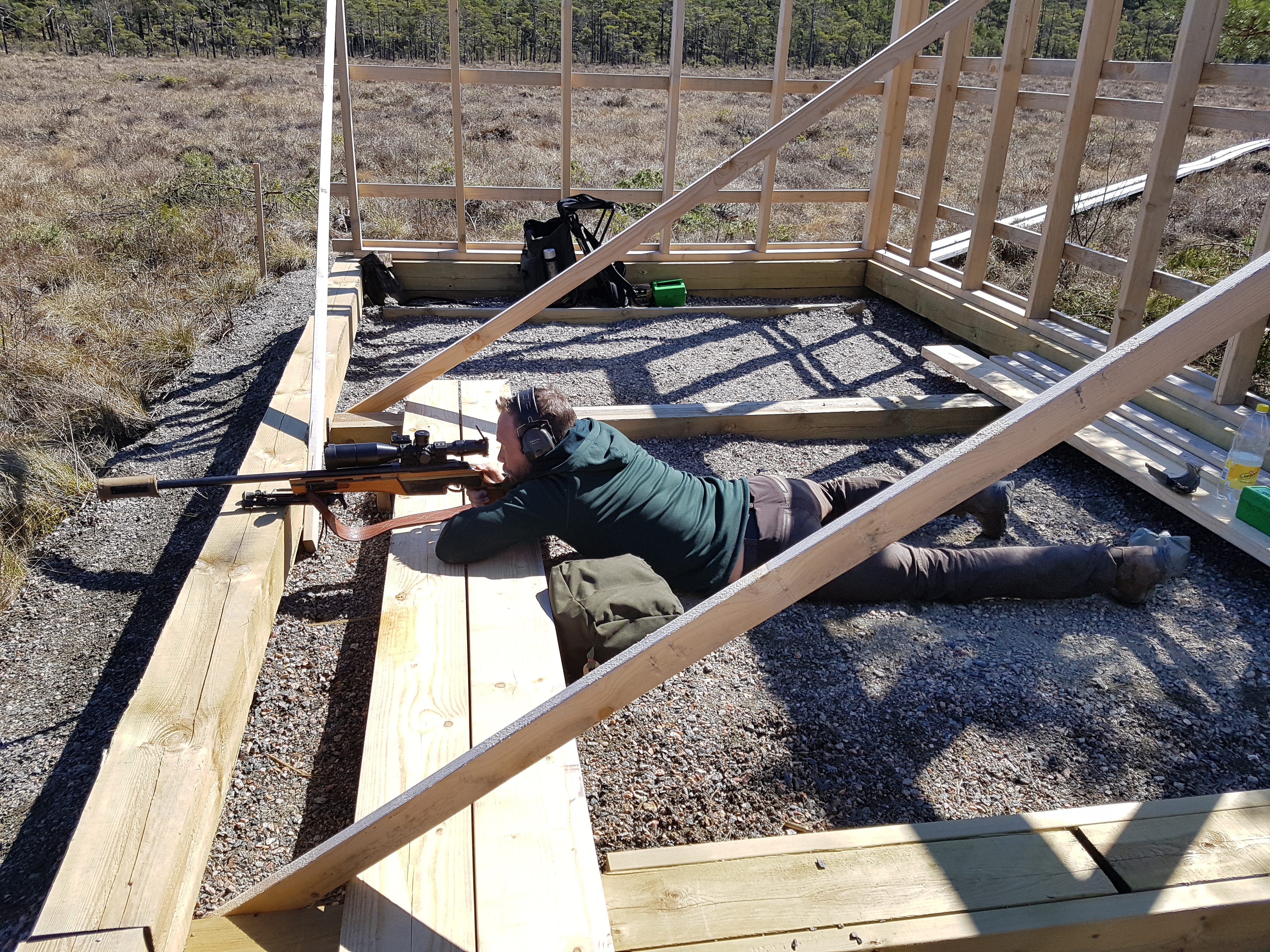 Efter kontroll av hastigheter och nolla backade vi bak och tränade praktiskt skytte. Klubbens icke färdigställda hus på 315m fungerade perfekt som ”stage” och erbjöd mängder av olika positioner att träna ifrån.