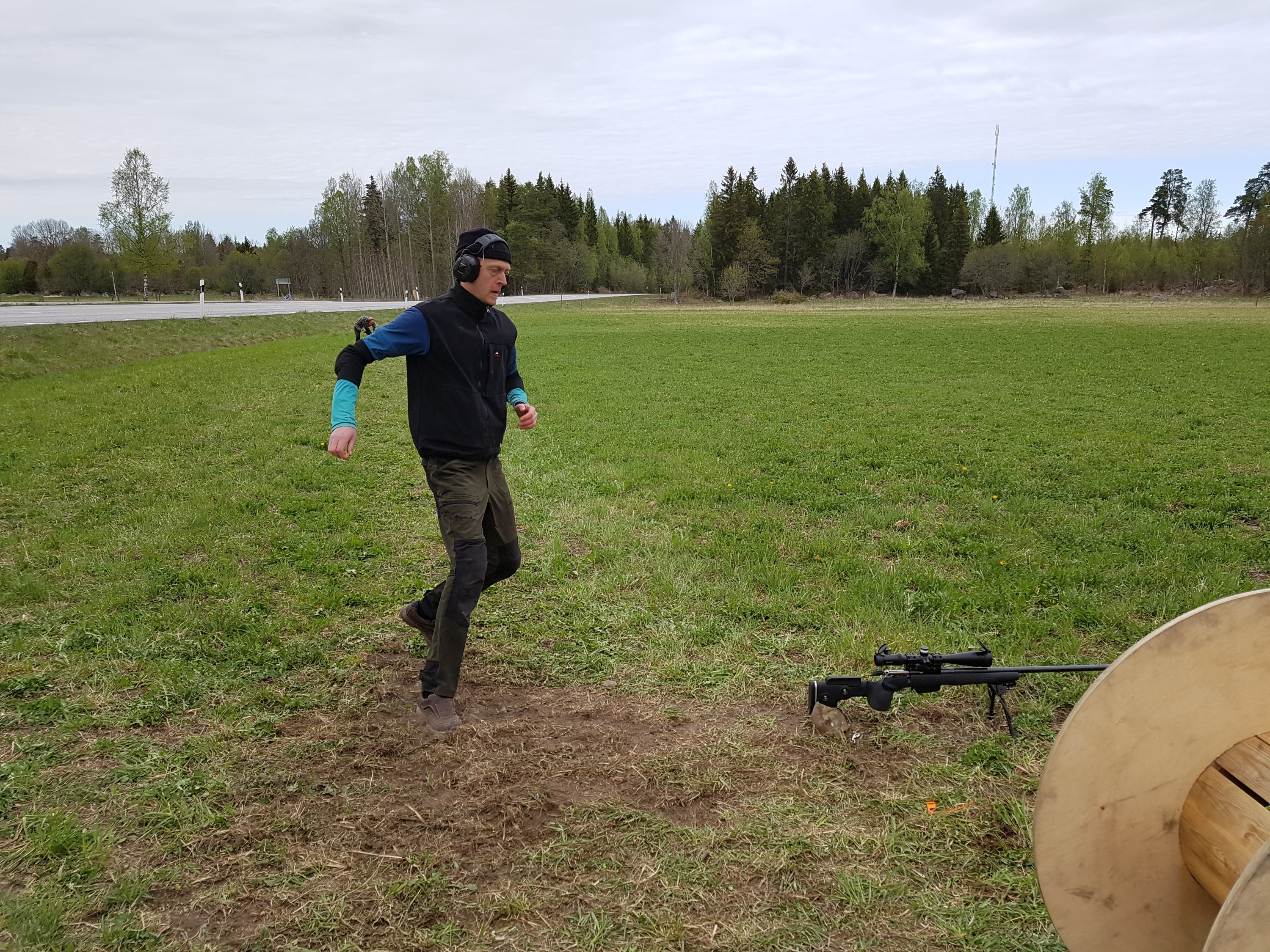 Självfallet måste även en pulsövning vara med. Här ses en skytt komma springandes efter att ha hämtat ett skott på station 2. Övningen sköts på ca 600 meter mot stålmål. Upplägget är enkelt, skytten sprintar bort efter varje skott och hämtar en ny patron ur en låda, detta under en maxtid. Här får skytten själv avgöra om den tänker försöka maximera antalet patroner eller säkerställa träff på något färre skott. Tror att jag själv skrapade ihop 5 träffar, kom ihåg att jag sköt en första bom, höll av för mycket för vinden och landade strax till vänster om målet.