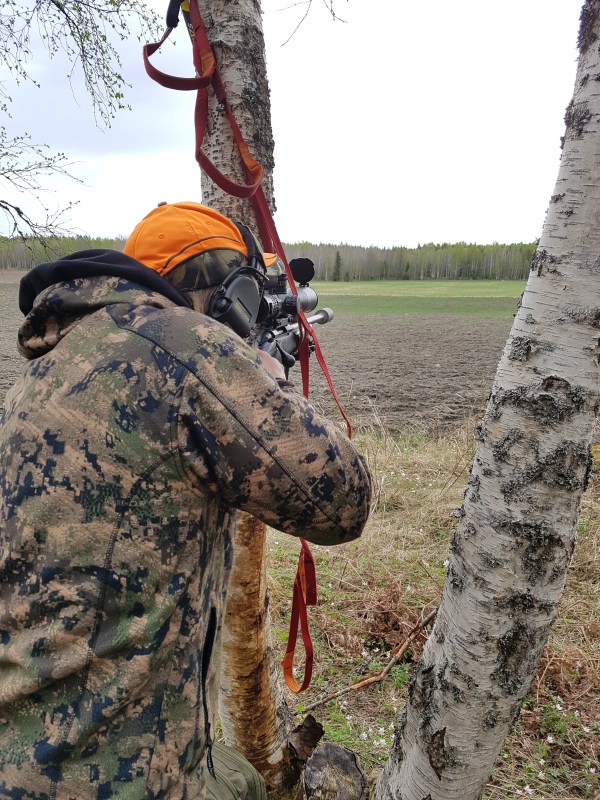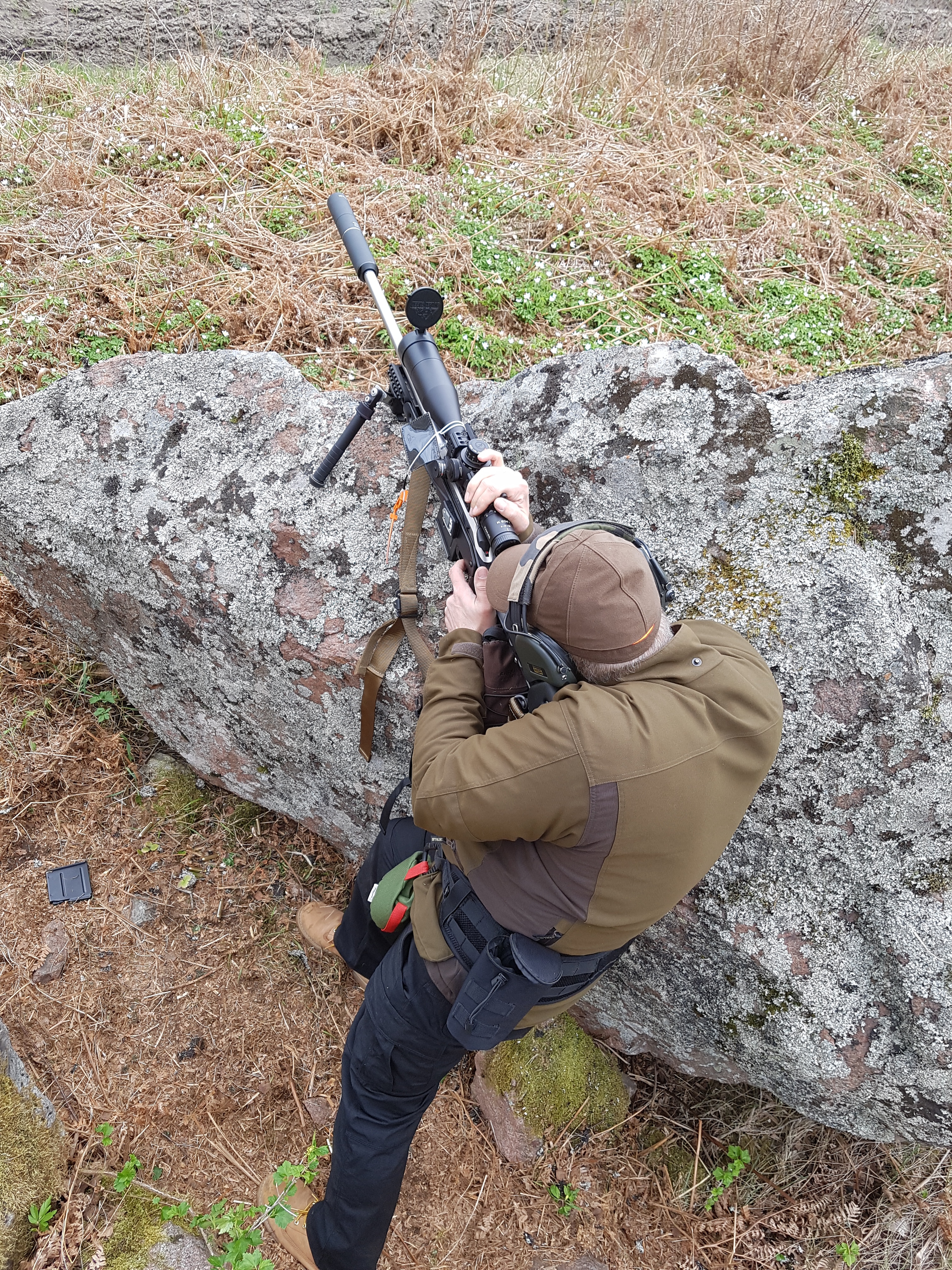 Denna bild är från sista övningen för vår patrull denna dag. Här skulle 4 skott skjutas från stark respektive svag axel från en stor sten. Just här hittade denna skytt en bra position och kunde nyttja sitt ”stora” benstöd för att hitta rätt. En enkel och bra station ur alla perspektiv.