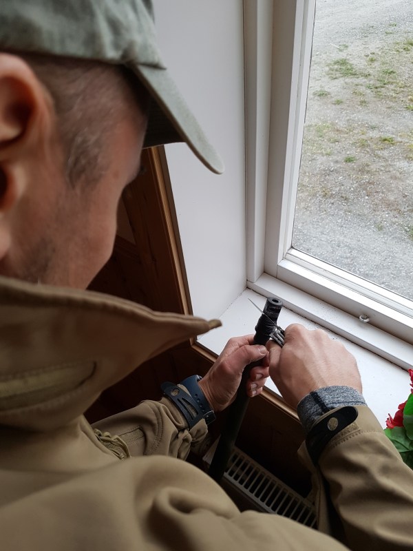 Efter att alla grupper skjutit 4 av 5 stationer avslutades tävlingsdagen och vi återsamlade för gemensam middag. Självfallet dyker en del problem upp med våra vapensystem efter det att vi skjutit ca 100 skott under dagen. Här ses en deltagare ”lösa” toleransproblem mellan rekylbroms och dämpare med sin kniv 🙂 Alla sätt är bra utom de dåliga. Senare under kvällen bjöd arrangörerna på en utmärkt middag och med tilltugg. Mycket trevlig tillställning innan kvällen avslutades med obligatoriska snacket om pipor, kalibrar och kulor.