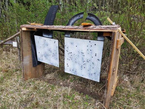 Så här såg grupp 4:as mål ut på 875m efter avslutat skytte på station 2. Rätt många träff i platarna. Dock var en lärdom att ha två separata målställ en bit från varandra så att inte missar skulle misstas som träffar då kulan träffar intilliggande plåt.