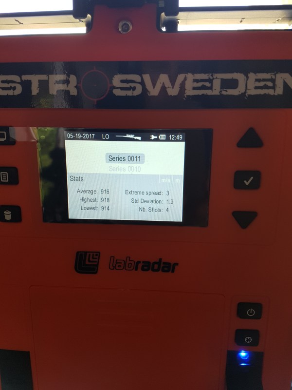 Som ni ser på bilden ovan är har jag efter rätt mycket arbete lyckats hitta en vinnande kombination kopplat till laddprocessen. En laddning som skjuter tätt och jämt. Labbradarn är ett otroligt smidigt verktyg, går snabbt att rigga och känns väldigt precis.
