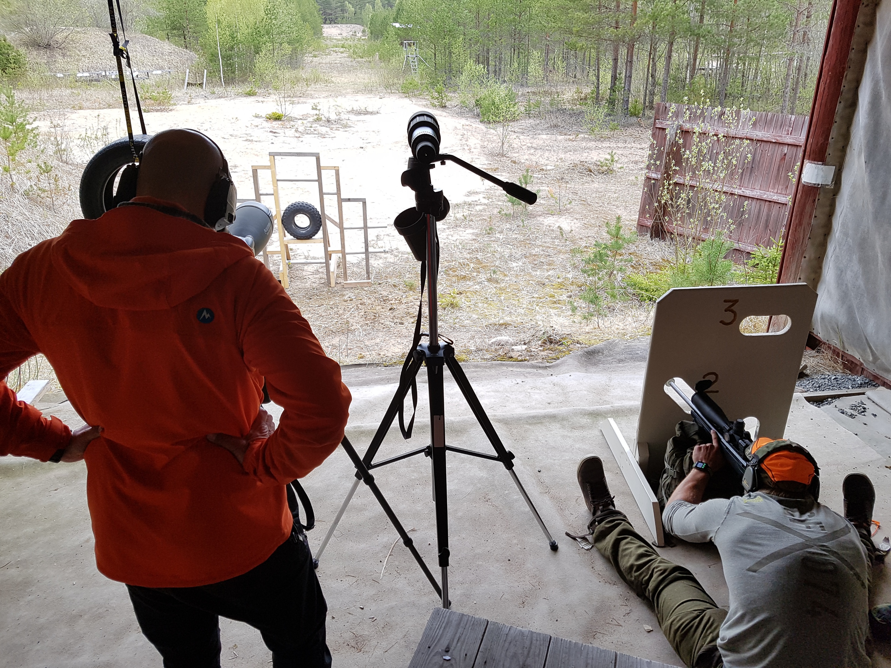 Varje station bestod i sin tur av 4 stycken skjutövningar. Ovan ser vi första övningen från station 5. Barikad skytte från tre olika positioner, längst ner 3 skott mot 10*10 cm plåt på 300m, sen 3+3 skott på något större mål på 300 meter. En kul och bra station som verkligen ställer krav på både skyttet och systemets egenprecision. Under alla stationer hjälpte gruppens deltagare till med att spotta träffar och föra protokoll i patrullpärmen. Framför spottern på bilden skymtar ni ett hängande däck och en barrikad, två olika stationer som även de sköts på 300m.