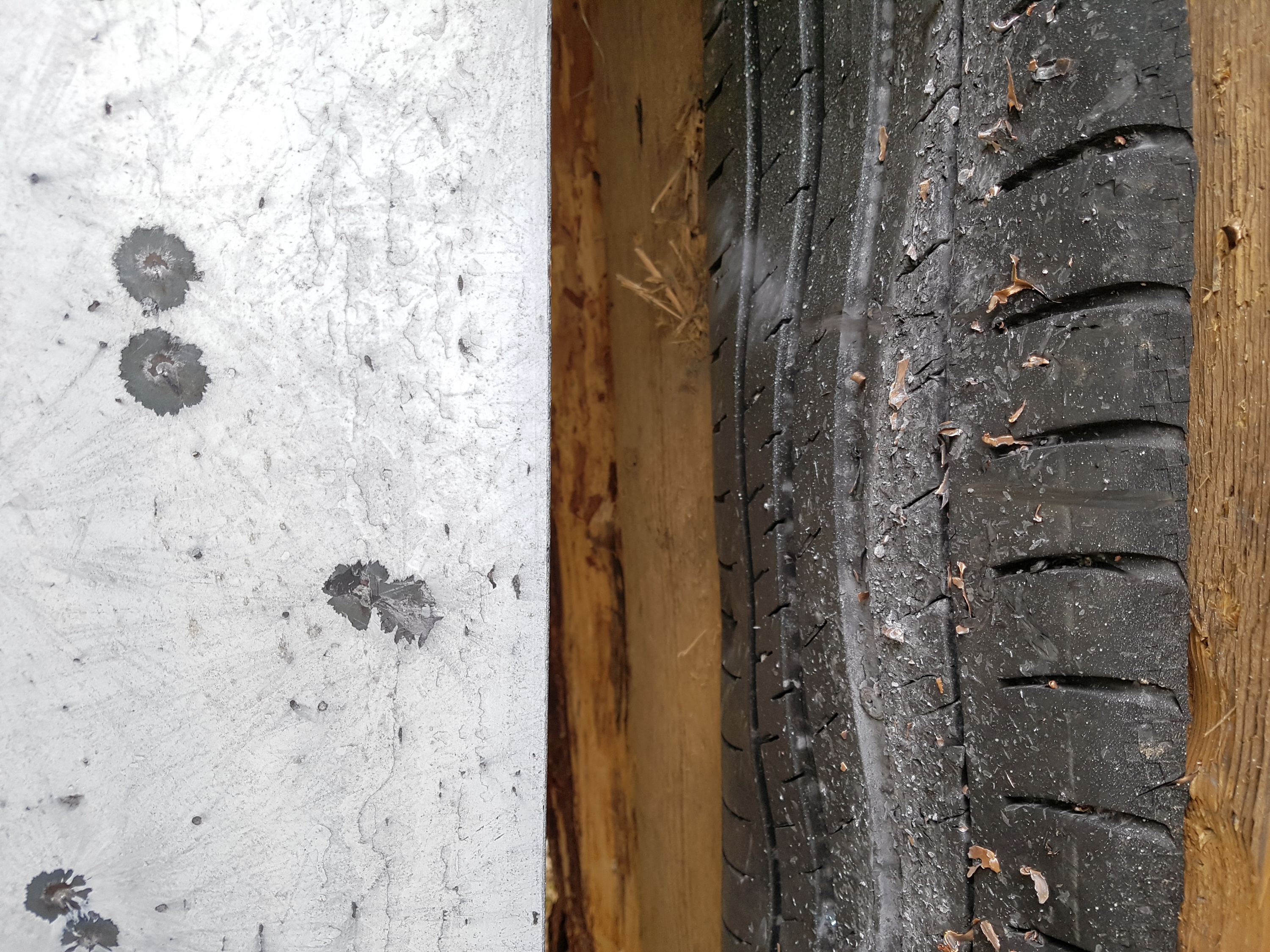 En hel del splitteravgång från kulorna. Slitytan på bildäck är grymt bra på att fånga upp dessa projektiler.