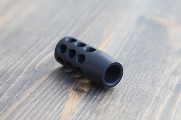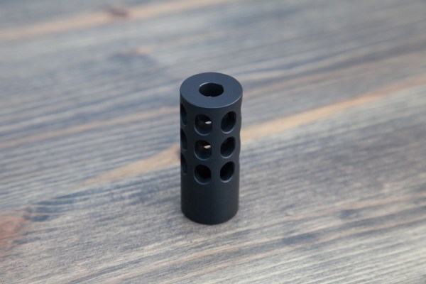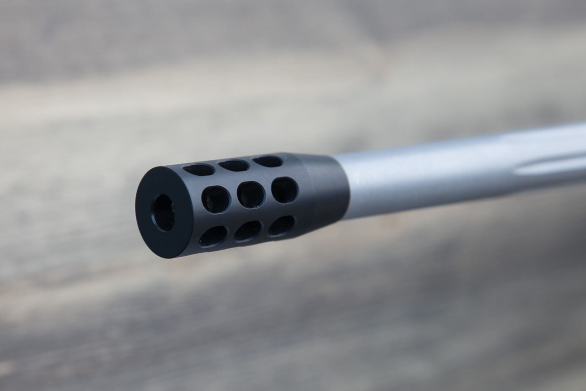 På M18*1 versionen, som syns på bild under, är bromsen en rak cylinder för att matcha pipan bättre. Denna broms passar perfekt på en Tikka T3 Varmint pipa.